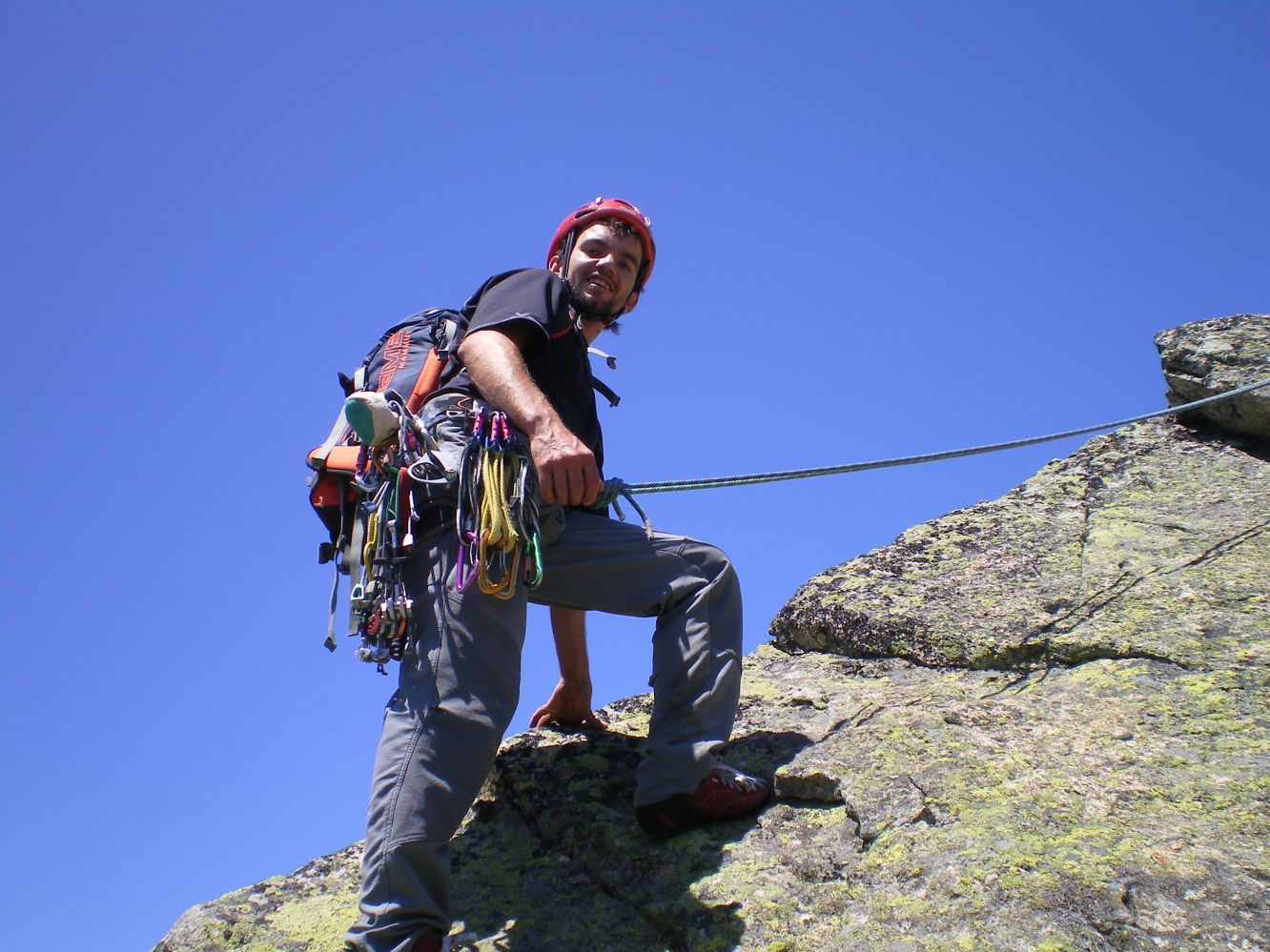 Deux Catalans arrivent sur la Main, en haut du Pilier Sud, écrivent ensuite: "Dans le dernier tronçon où se trouve le rappel, sorti de nulle part un homme est apparu comme un fantôme, seul et sans corde, à moitié en langue des signes française, anglaise et internationale, nous nous sommes compris. Tout un personnage, qui avait fait la via Joséphine 1000m D dans le Sud et puis pour faire les Tapas Sans Dalles 300m D ne manquez pas son site Denis Corpet.", voire leur Blog. Au sommet de la dent, Fayçal Bentrob, "sherpa" souriant et généreux m'offre un abricot délicieux, une pêche juteuse, une banane énergétique, un litre d'eau fraiche, avec un sourire !! Col de Brasseil: blonde+catalan me disent le Topo de Tapas. Dans Tapas, beaucoup de monde: 2 garçons une fille R2, 3 gars une fille avec de gros pb de noeuds dans leur corde, R5, Juliette et ses parents R7, et quatre autres cordées sur la fin.