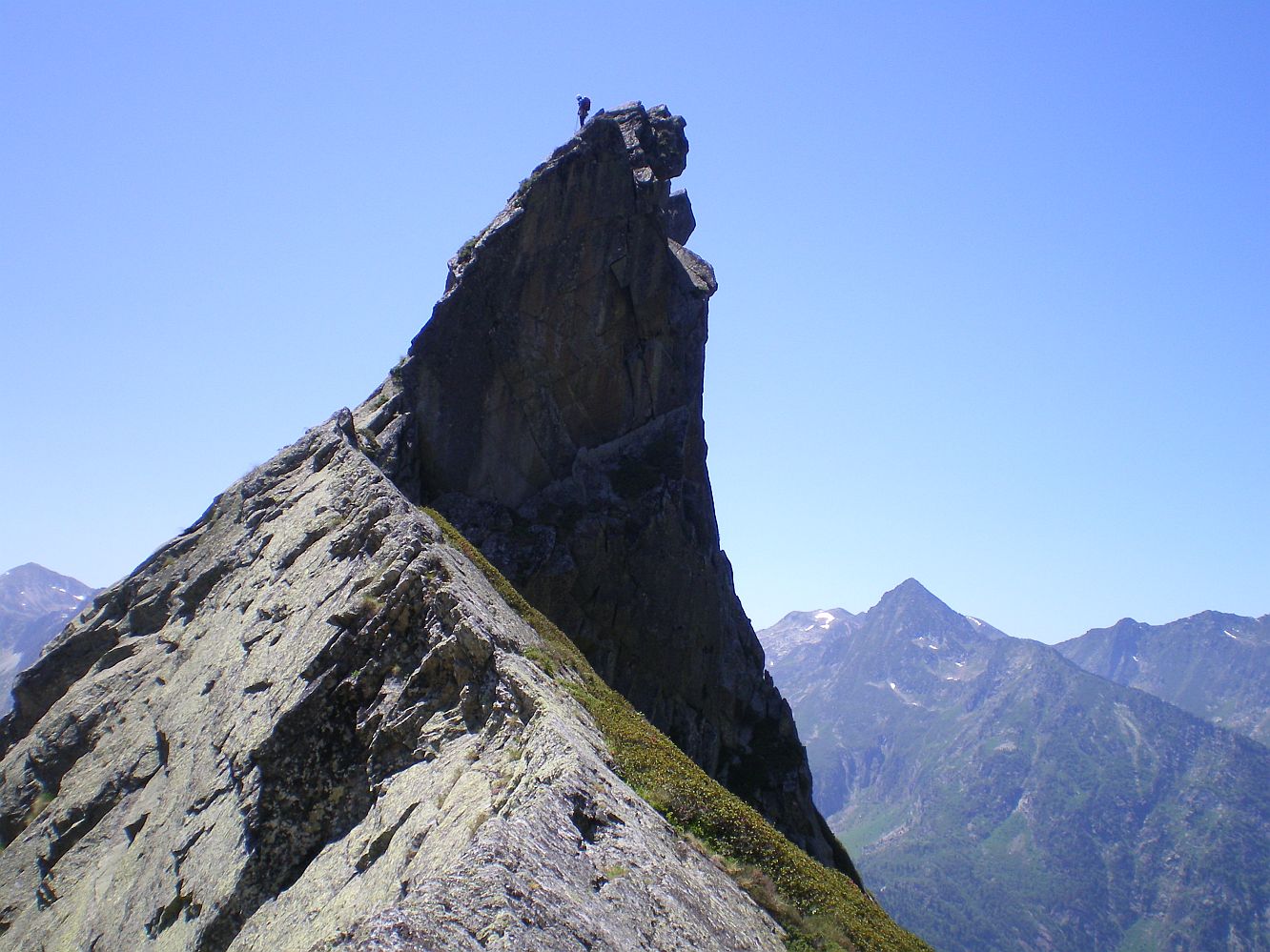 - La Main: j'ai donc été faire un aller-retour Taillante-Main. On monte facilement sur le coté gauche du Pouce dans les dalles Est (3 avec un pas de 4). Puis on peut traverser juste sous "les doigts", par des vires à gauche, pour aller admirer la sortie du Pilier Sud. et là, je vois sortir deux Catalans sympas mais ne parlant ni anglais ni français: sur les photos ça ne se voit pas ! Je leur évite un rappel du haut du Pouce à G, en leur explicant la descente à Dr, et ils postent notre rencontre d'Orlu en Catalan