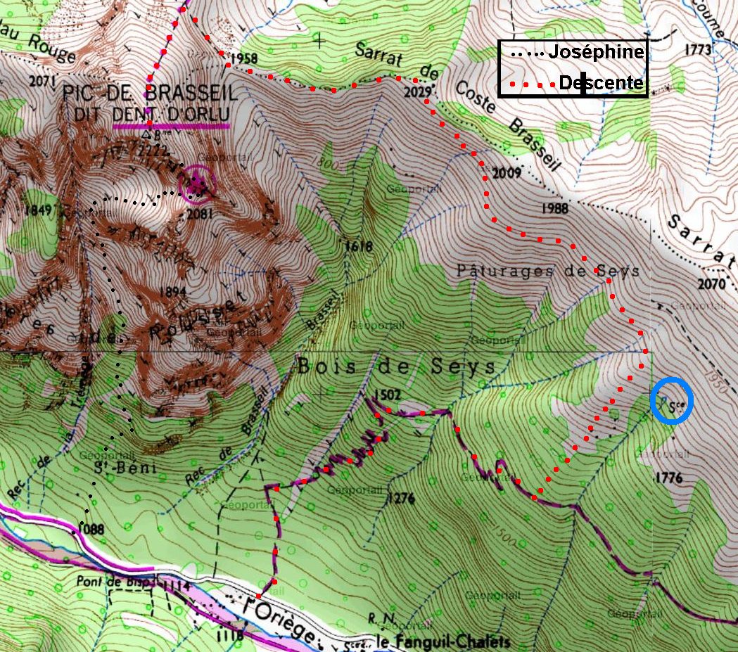 Ce mail juste pour te signaler que j'ai balisé (en rouge) et nettoyé une descente directe vers le pont du bisp pour éviter de faire le grand tour.