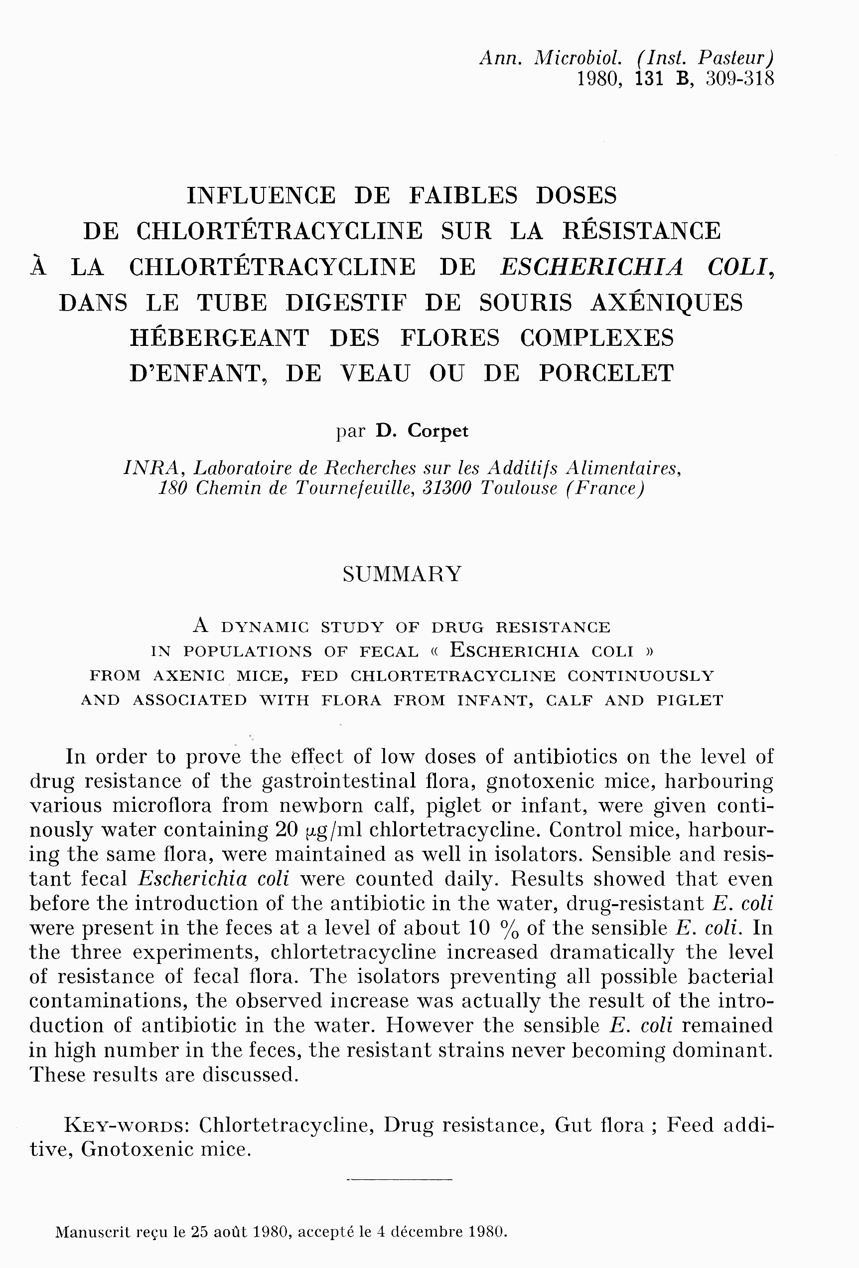 Abstract dans PubMed. Article original des An.Microbiol.80: A dynamic study of drug resistance in populations of fecal Escherichia coli from axenic mice, fed chlortetracycline continuously and associated with flora from infant, calf and piglet. scan page 309.
