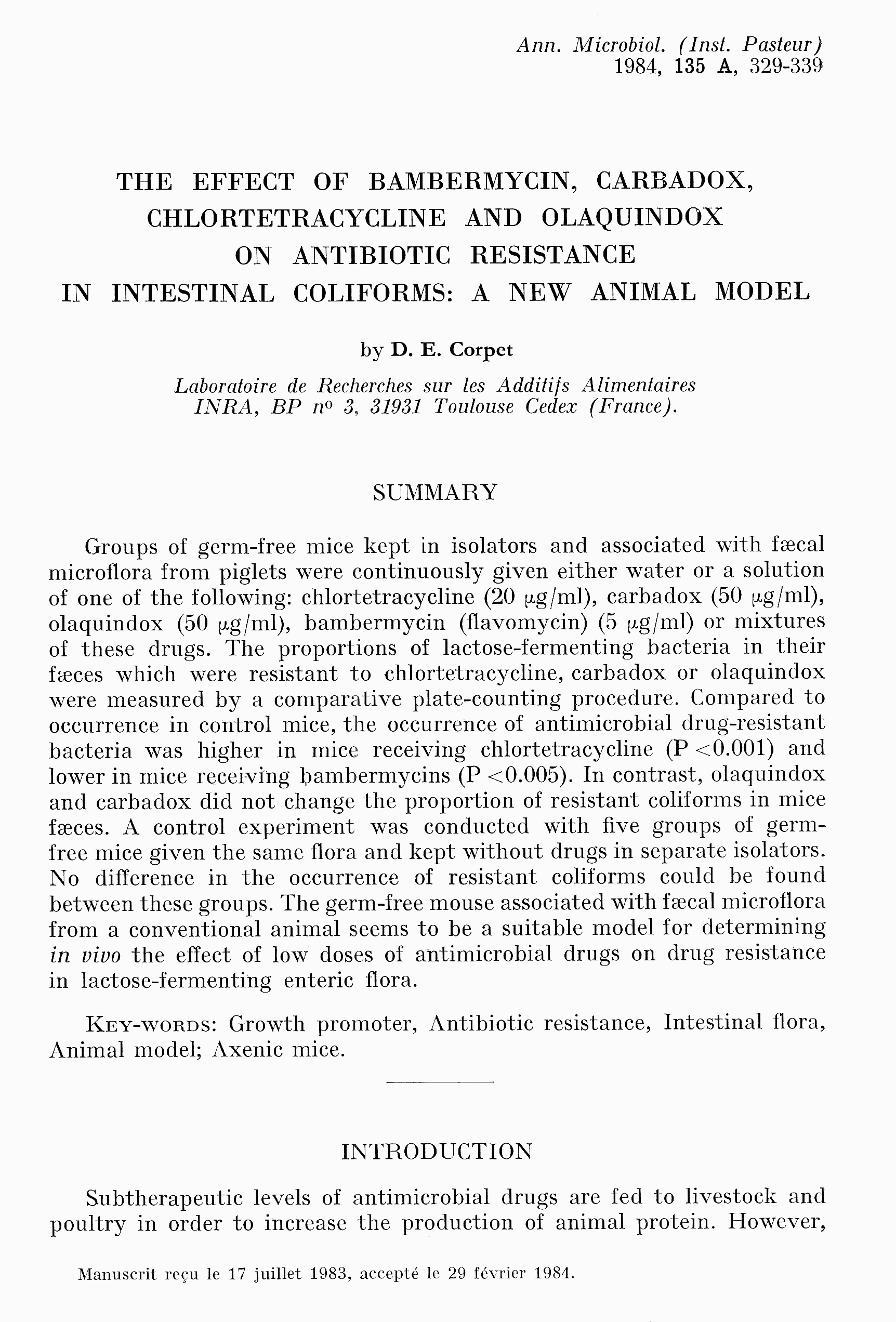 Article original sur OATAO: An.Microbiol. 1984, The effect of bambermycin, carbadox, chlortetracycline and olaquindox on antibiotic resistance in intestinal coliforms: a new animal model
