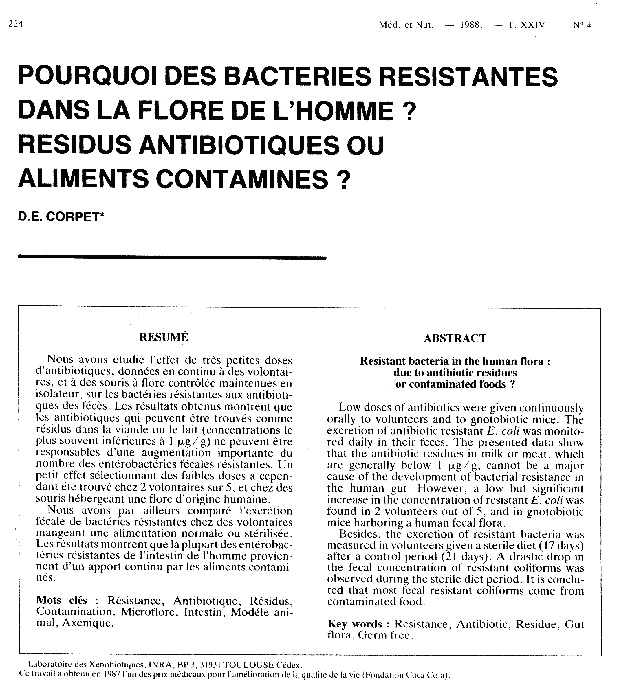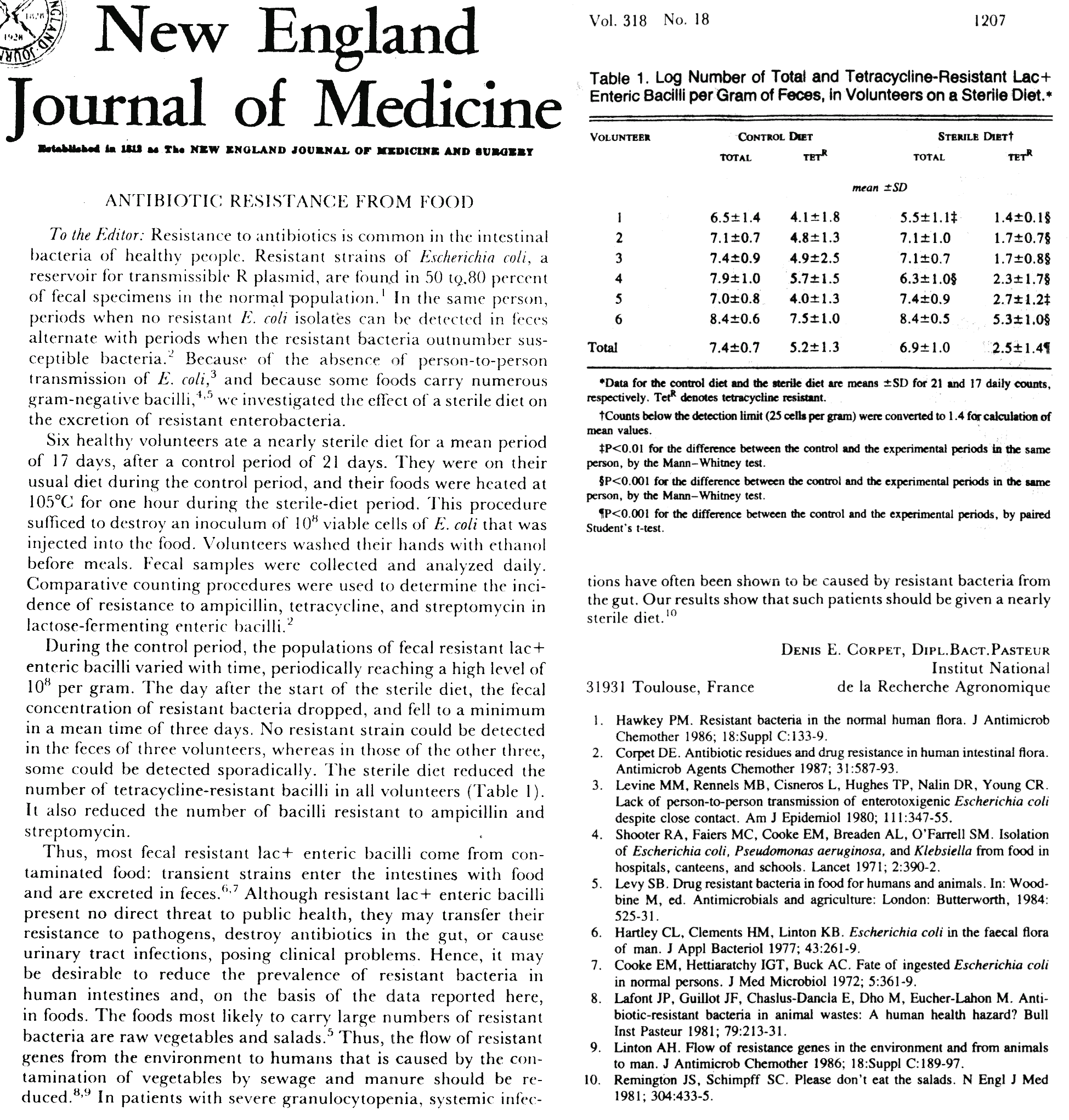 Abstract dans PubMed, l'article complet dans Antimicrobial Agents & Chemotherapy est disponible gratuitement sur le site de l'American Society for Microbiology: [Corpet, 1987, Antibiotic residues and drug resistance in human intestinal flora]