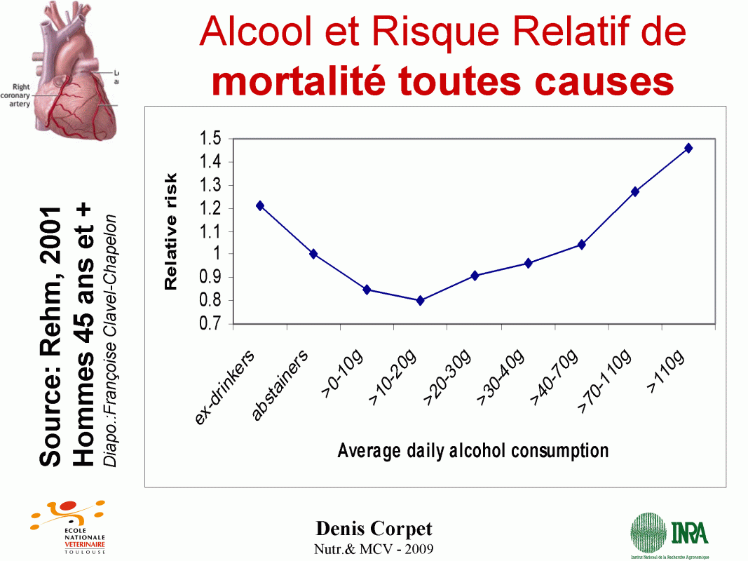 Oui, l'alcool protège le coeur, mais c'est controversé. Je pense qu'une consommation modérée (1-3 v/j) et régulière d'alcool est bénéfique en cardio-vasculaire. Tout alcool semble bénéfique, et l'effet du vin rouge est plus net encore, surtout semble-t-il les vins du Gers comme Madiran et Saint-Mont qui contiennent 2 à 4 fois plus de "bons polyphénols" que la moyenne des vins du monde (Corder, Nature, 2006). Beaucoup d'études épidémiologiques montrent que les abstinents ont une mortalité supérieure aux buveurs modérés (toutes causes confondues), mais qu'au-delà de 3 verres par jour la mortalité augmente (voir courbe en U ci-contre. Un p'tit ballon = 12g alcool). Attention ! 2 verres chaque jour c'est pas 14 verres le samedi soir ! Plusieurs mécanismes biologiques, bien démontrés chez l'animal, expliquent cette protection (moindre agrégation plaquettaire, conversion du LDL en HDL, protection des lipides endothéliaux contre l'oxydation). La controverse porte sur les abstinents (totaux ou ex-buveurs) et sur le mode de vie «plus sain» des buveurs modérés, ce qui peut changer les conclusions. Et il faut bien reconnaitre que l'hypothèse qu'un verre de vin par jour diminue la mortalité cardiovasculaire n'a jamais été testée sérieusement dans une intervention randomisée (essai clinique). Par ailleurs la consommation modérée de vin rouge semble protéger contre le vieillissement du cerveau (Alzheimer et démences séniles) <= cliquer pour voir doc. pdf). Les infirmière américaines qui ont bu chaque jour 1 à 3 verres vieillissent mieux que les autres (meilleure santé physique et mentale) (Sun, PLoS medicine, 2011). Enfin, le vin protégerait même ... contre le cancer ! Kontou N. observe que les Grecs qui boivent entre 1 et 3 verres par jour ont un rique de cancer colorectal divisé par deux ou trois (Dis.Colon Rect. 55:703-10, 2012). C'est aussi ce que montre une étude française toujours pas publiée, ce qui est un peu "louche", de D.Lanzmann (texte .pdf).