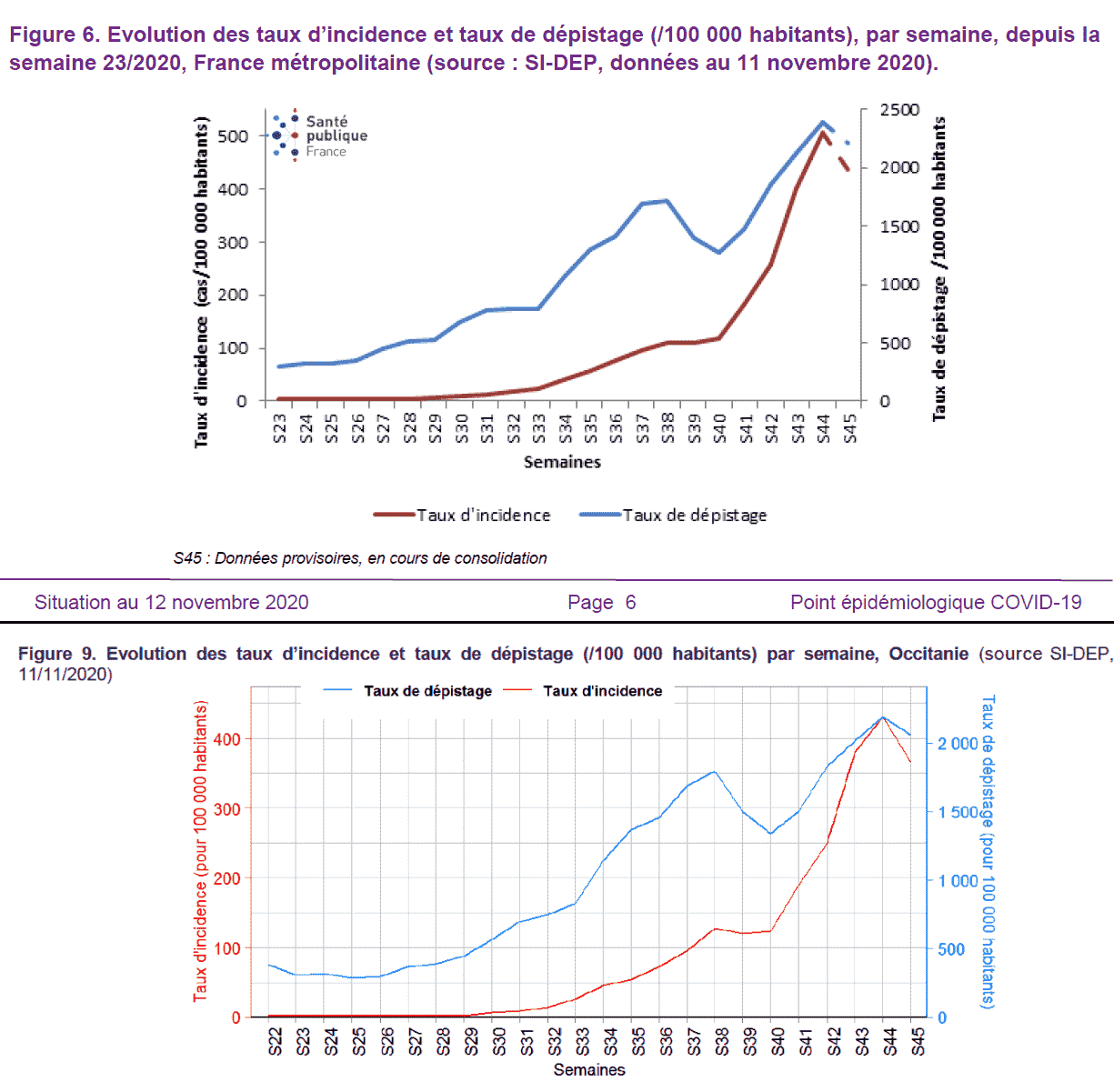 Le taux d'incidence hebdomadaire est publié sur le site officiel Covid SI-DEP. C'est le nombre de tests positifs dans la semaine, chez ceux qui sont testés par PCR pour l'ARN du coronavirus. Mais ceux qui se font tester sont une minorité (un ou 2% des gens): le taux "oublie" donc la grande majorité, ceux qui ne font pas le test. Du coup, ce taux est très sensible aux conditions qui conduisent les gens à se faire tester. En mars-avril on faisait très peu de tests: la première vague épidémique ne se voit presque pas sur la courbe d'incidence ! De début août à fin octobre le taux de dépistage a beaucoup augmenté en France, et l'incidence aussi (voir les courbes !). Quand on ouvre un nouveau centre de tests dans une ville, le taux d'incidence augmente, indépendamment de l'épidémie. Quand les tests salivaires rapides et peu couteux seront disponibles, plein de gens feront le test, et le taux d'incidence augmentera surement*. Au contraire, quand les tests PCR seront payants, les gens vont se faire tester beaucoup moins, et on verra le taux d'incidence baisser !