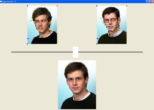-Le domaine où ce type de programme peut être le plus efficace, ce sont les visages. Il fait apparaître les domaines où cet algorithme est efficace et ceux où il ne l'est pas. Il est plus facile de tester son efficacité, puisqu'on peut facilement juger si une image intermédiaire, en particulier t=0,5 le critère est : "l'image ressemble-t-elle à un visage humain ?". On constate par exemple qu'en ne plaçant que quelques points (au niveau des yeux, du nez, de la bouche) on obtient au centre du visage de très bons résultats : les yeux, le nez et la bouche ont l'air réels. Un exemple avec cette image qui n'utilise que 5 points caractéristiques.