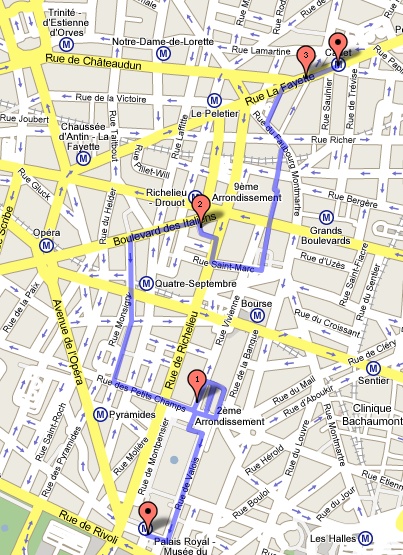 Voici le circuit que j'ai effectué avec un guide de l'association "Passages et Galeries de Paris". Il passe principalement dans les passages des grands boulevards de Paris (Passages des Panoramas, Passage Jouffroy et Passage Verdeau).