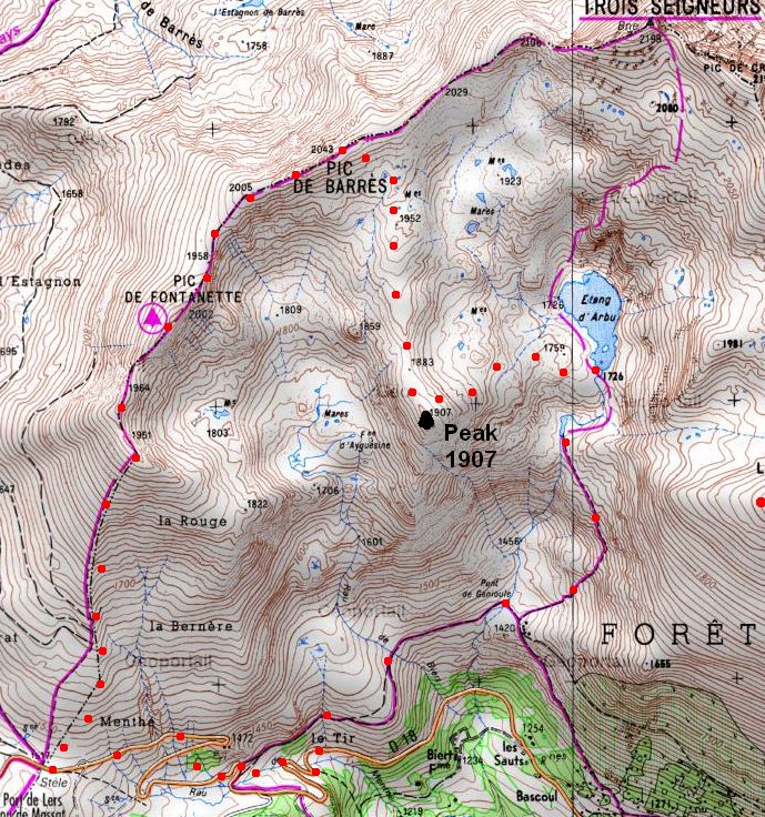 Nous y montâmes, puis suivîmes la crête S-N menant au Pic Barrès 2043 m, puis reprîmes à gauche l'ascension du Pic de Fontanette 2002m, pour redescendre enfin sur le Port de Lers. Rien de bien dur malgré deux trois passage un peu raide vu l'état de la neige et notre équipement