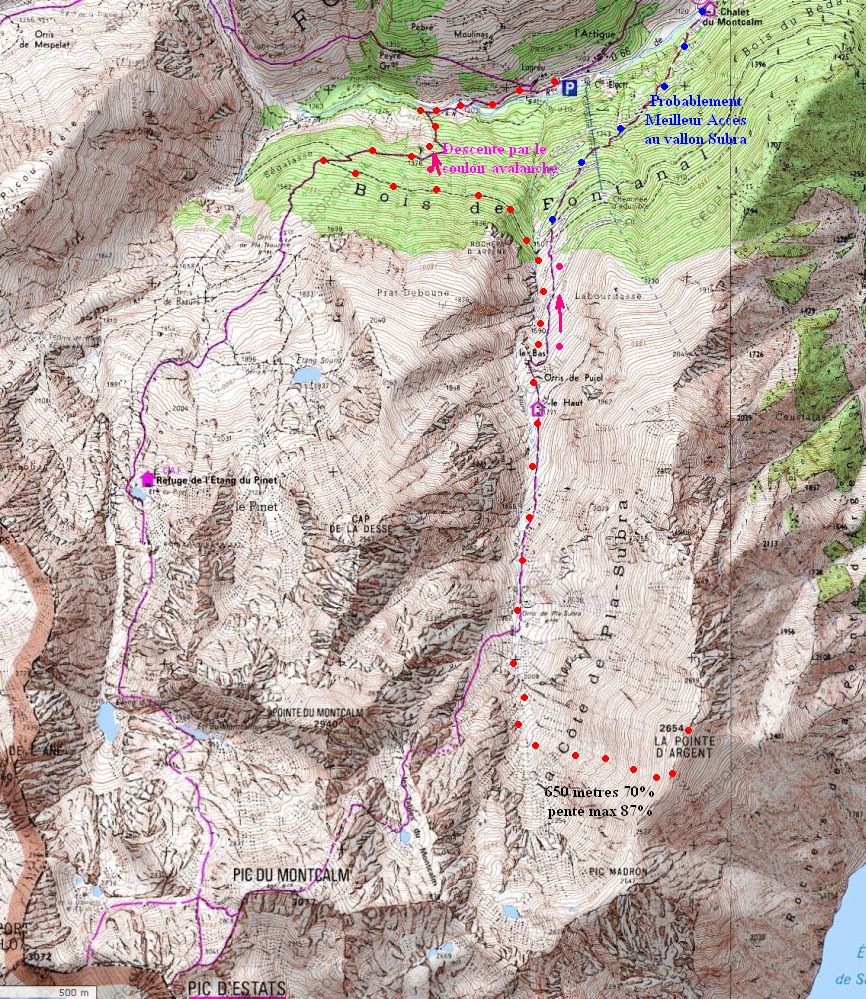 Pente terminale 650 m continus, pente moyenne 70% =35°, passages 87% =41°