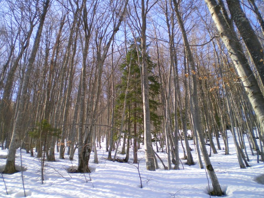 Neige très dure le matin, donc une partie faite à pied mais sans crampons,en bas dans la forêt et la raide pente terminale