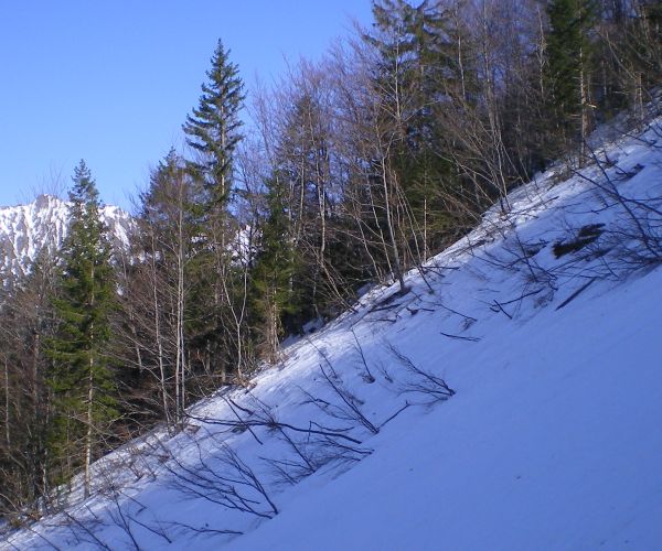 Neige très dure le matin, donc une partie faite à pied mais sans crampons,en bas dans la forêt et la raide pente terminale