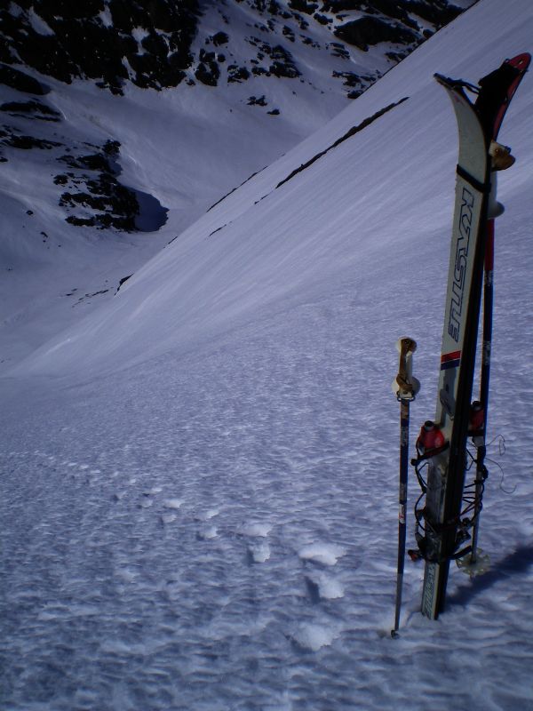 Neige très dure le matin, donc une partie faite à pied mais sans crampons,en bas dans la forêt et la raide pente terminale