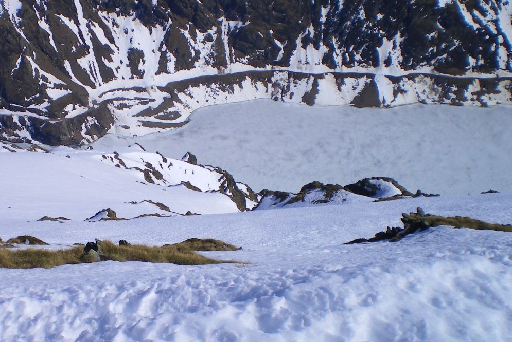Neige très dure le matin, donc une partie faite à pied mais sans crampons,en bas dans la forêt et la raide pente terminale