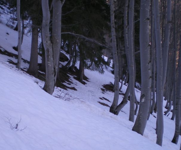 Neige très dure le matin, donc une partie faite à pied mais sans crampons,en bas dans la forêt et la raide pente terminale