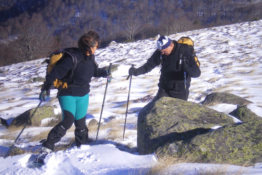 Belle neige, peu profonde: raquettes utiles, pas indispensables.