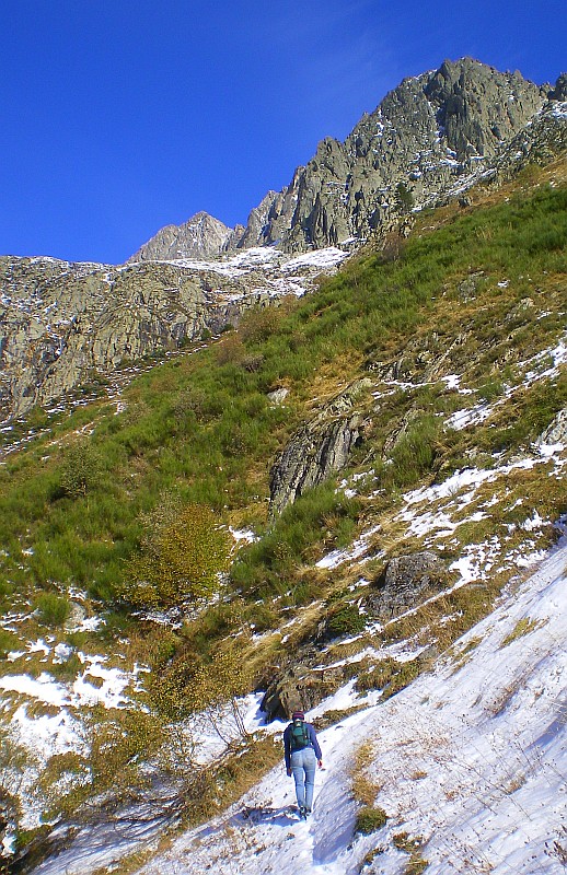 Randonnée sur un vague sentier balisé (marques jaunes sur les rochers),