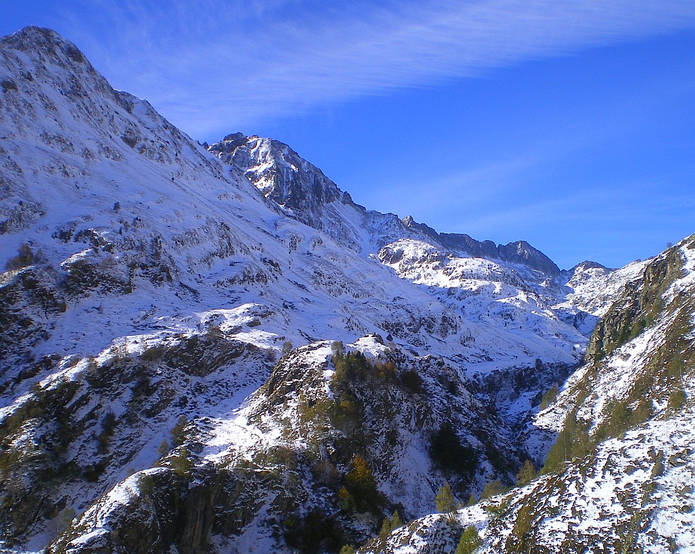 Montagne granitique enneigée, mais les arbres sont encore verts !
