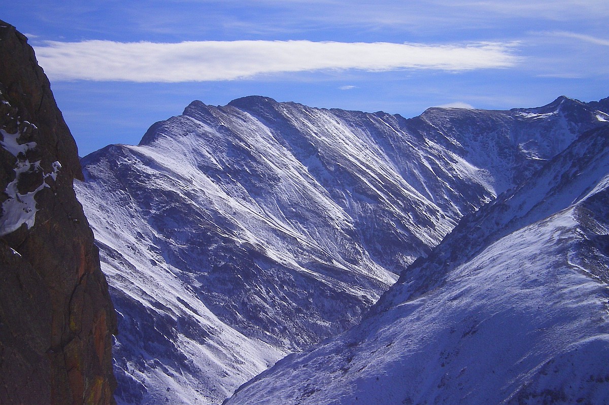 Montagne granitique enneigée, mais les arbres sont encore verts !