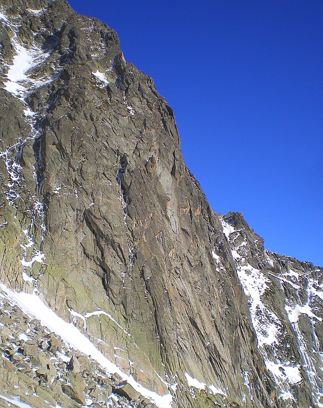 Montagne granitique enneigée, mais les arbres sont encore verts !