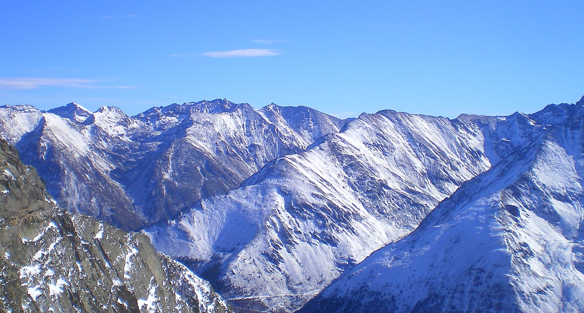 Montagne granitique enneigée, mais les arbres sont encore verts !