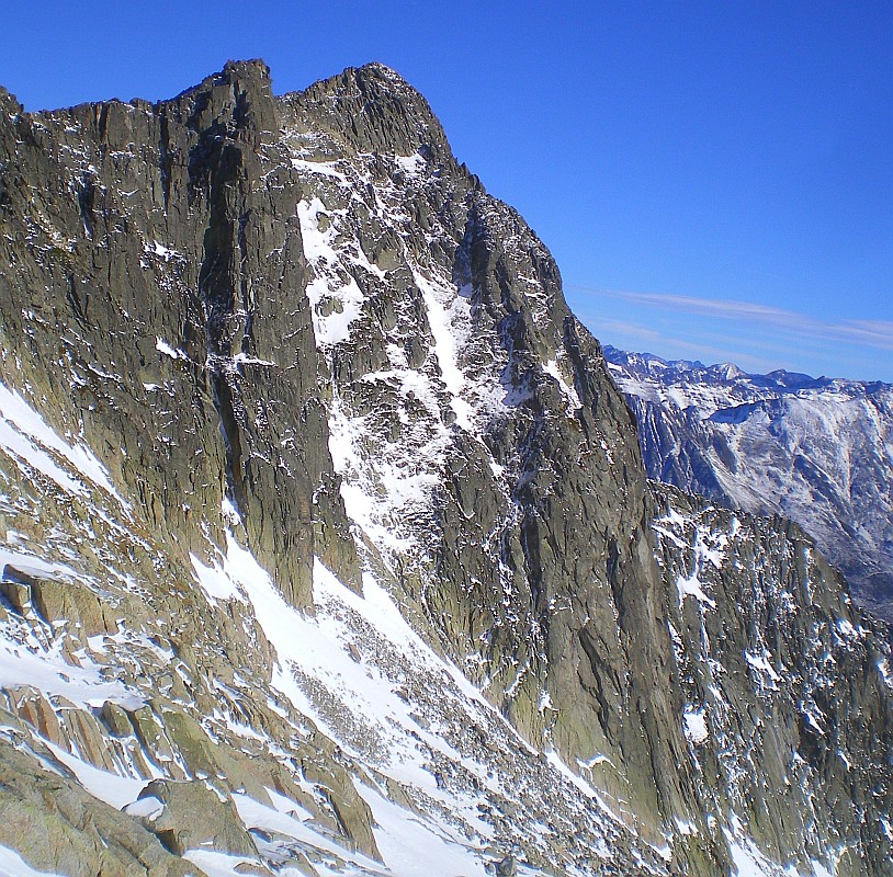Montagne granitique enneigée, mais les arbres sont encore verts !