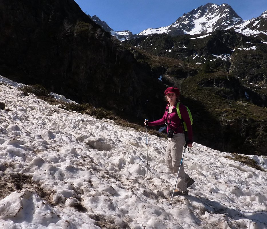 Avec Melge nous n'avons pas vu ce GR à la montée. Nous avons contourné par les pentes de neige sur la droite, en montant vers les "Hommes de Pierre", pour revenir à gauche vers 2400m par une pente raide de neige dure, mais sans danger. Ouf ! de l'autre coté on domine légèrement le petit étang Fourcat, sur lequel on redescend très facilement. Nous sommes ensuite redescendus par le GR10, bien cairné et marqué de ce coté ci. Mais la partie raide était dangereuse aussi en descente, et nous avons fait quelques pas de 3 sur rodhodendron pour éviter des passages verglacés.