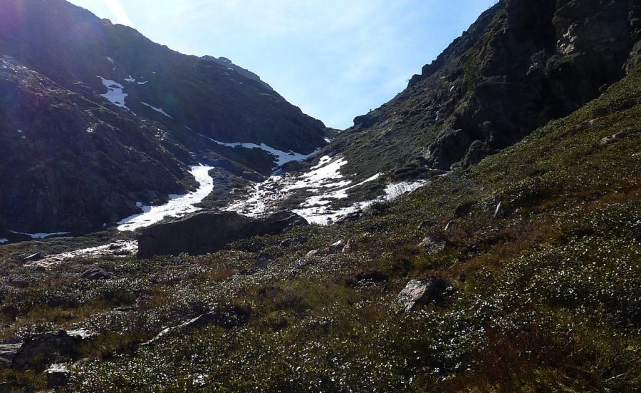 Après le beau replat et la passerelle de Caudière, le GR10 passe dans une barre rocheuse raide, très dangereuse en hiver (neige et glace), mais qu'on peut éviter.