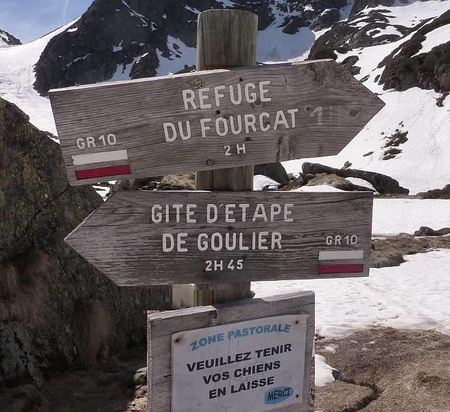 Avec Melge nous n'avons pas vu ce GR à la montée. Nous avons contourné par les pentes de neige sur la droite, en montant vers les "Hommes de Pierre", pour revenir à gauche vers 2400m par une pente raide de neige dure, mais sans danger. Ouf ! de l'autre coté on domine légèrement le petit étang Fourcat, sur lequel on redescend très facilement. Nous sommes ensuite redescendus par le GR10, bien cairné et marqué de ce coté ci. Mais la partie raide était dangereuse aussi en descente, et nous avons fait quelques pas de 3 sur rodhodendron pour éviter des passages verglacés.