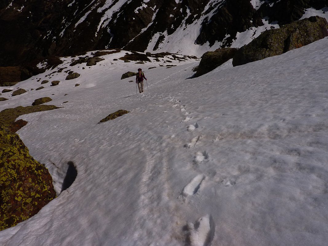 Avec Melge nous n'avons pas vu ce GR à la montée. Nous avons contourné par les pentes de neige sur la droite, en montant vers les "Hommes de Pierre", pour revenir à gauche vers 2400m par une pente raide de neige dure, mais sans danger. Ouf ! de l'autre coté on domine légèrement le petit étang Fourcat, sur lequel on redescend très facilement. Nous sommes ensuite redescendus par le GR10, bien cairné et marqué de ce coté ci. Mais la partie raide était dangereuse aussi en descente, et nous avons fait quelques pas de 3 sur rodhodendron pour éviter des passages verglacés.