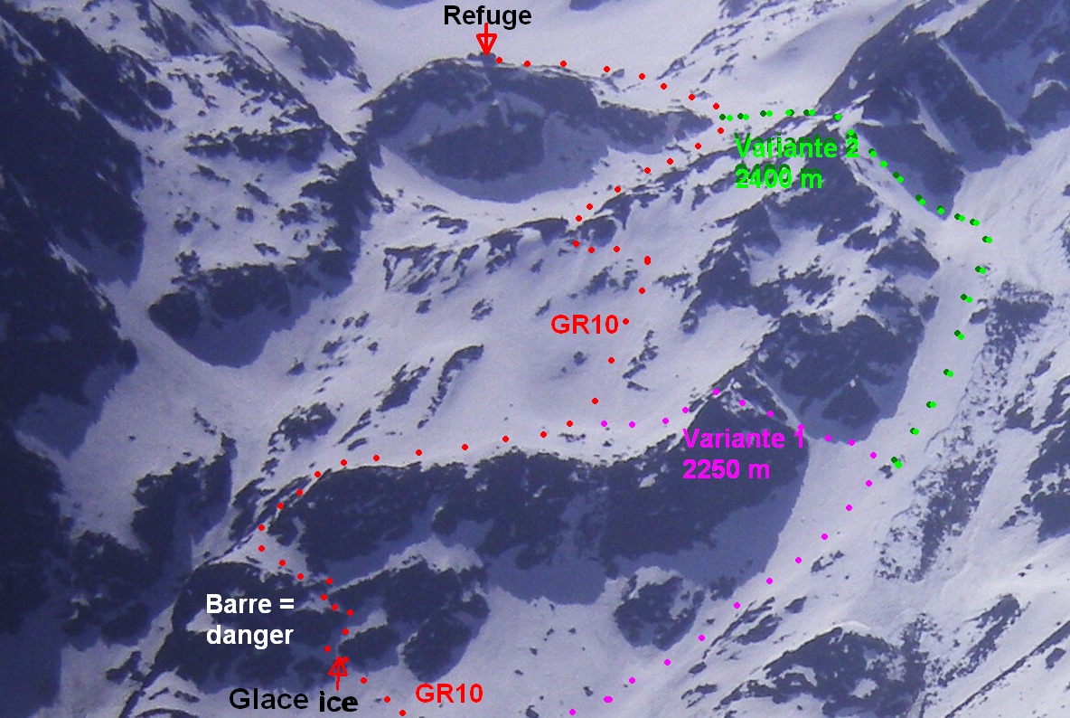 Avec Melge nous n'avons pas vu ce GR à la montée. Nous avons contourné par les pentes de neige sur la droite, en montant vers les "Hommes de Pierre", pour revenir à gauche vers 2400m par une pente raide de neige dure, mais sans danger. Ouf ! de l'autre coté on domine légèrement le petit étang Fourcat, sur lequel on redescend très facilement. Nous sommes ensuite redescendus par le GR10, bien cairné et marqué de ce coté ci. Mais la partie raide était dangereuse aussi en descente, et nous avons fait quelques pas de 3 sur rodhodendron pour éviter des passages verglacés.