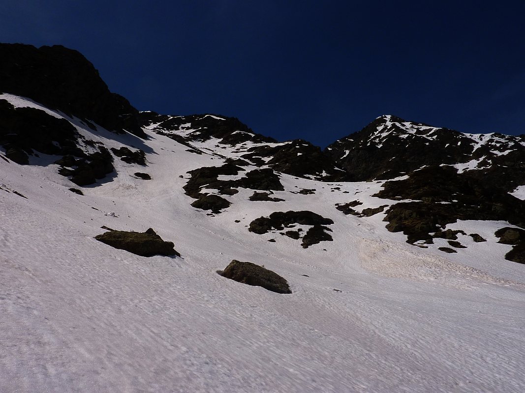 Après le beau replat et la passerelle de Caudière, le GR10 passe dans une barre rocheuse raide, très dangereuse en hiver (neige et glace), mais qu'on peut éviter.