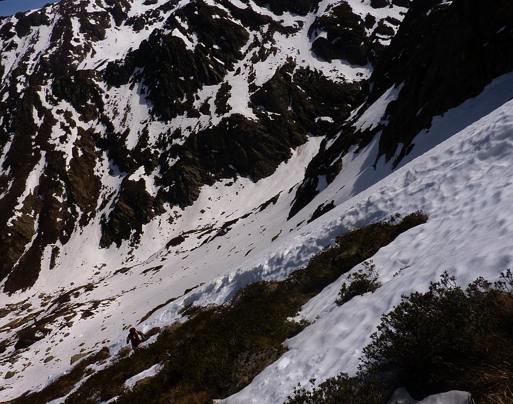 Après le beau replat et la passerelle de Caudière, le GR10 passe dans une barre rocheuse raide, très dangereuse en hiver (neige et glace), mais qu'on peut éviter.