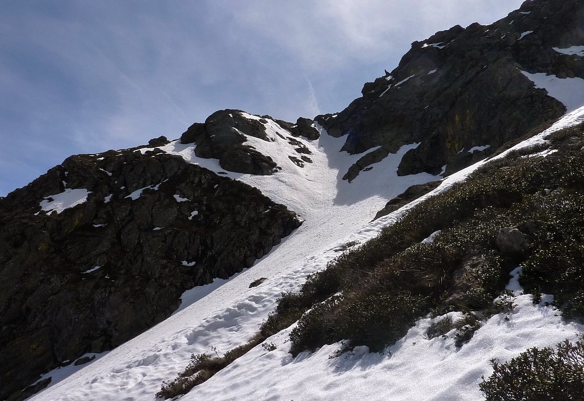 Après le beau replat et la passerelle de Caudière, le GR10 passe dans une barre rocheuse raide, très dangereuse en hiver (neige et glace), mais qu'on peut éviter.