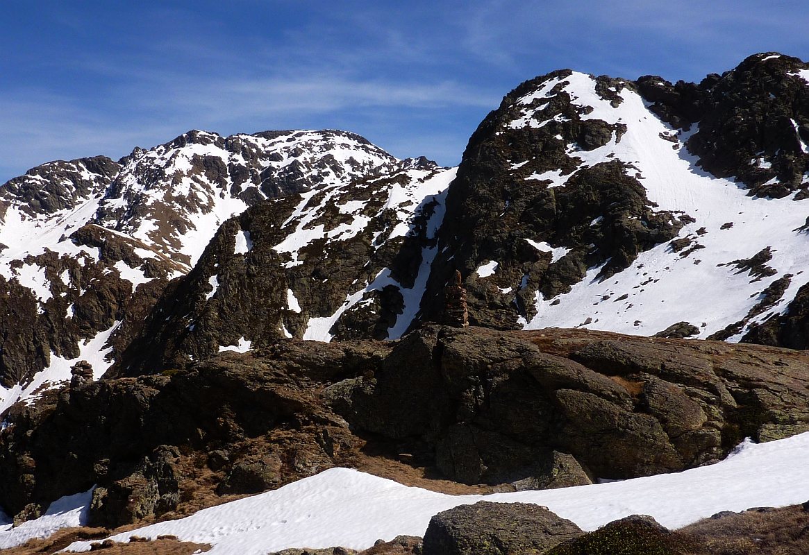 Avec Melge nous n'avons pas vu ce GR à la montée. Nous avons contourné par les pentes de neige sur la droite, en montant vers les "Hommes de Pierre", pour revenir à gauche vers 2400m par une pente raide de neige dure, mais sans danger. Ouf ! de l'autre coté on domine légèrement le petit étang Fourcat, sur lequel on redescend très facilement. Nous sommes ensuite redescendus par le GR10, bien cairné et marqué de ce coté ci. Mais la partie raide était dangereuse aussi en descente, et nous avons fait quelques pas de 3 sur rodhodendron pour éviter des passages verglacés.