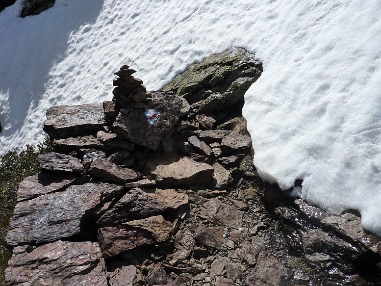 Avec Melge nous n'avons pas vu ce GR à la montée. Nous avons contourné par les pentes de neige sur la droite, en montant vers les "Hommes de Pierre", pour revenir à gauche vers 2400m par une pente raide de neige dure, mais sans danger. Ouf ! de l'autre coté on domine légèrement le petit étang Fourcat, sur lequel on redescend très facilement. Nous sommes ensuite redescendus par le GR10, bien cairné et marqué de ce coté ci. Mais la partie raide était dangereuse aussi en descente, et nous avons fait quelques pas de 3 sur rodhodendron pour éviter des passages verglacés.