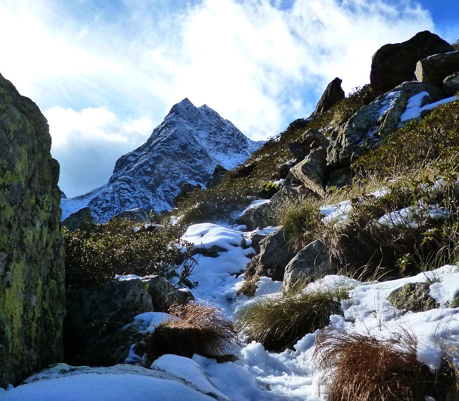 Très belle vue du sommet, montée longue, raide, pas mal de neige, et de la glace +1700m. Il aurait fallu des crampons que je n'avais pas: j'ai trouvé une astuce pour contourner sans danger le passage du GR dans une barre rocheuse avec des cascades de glaces