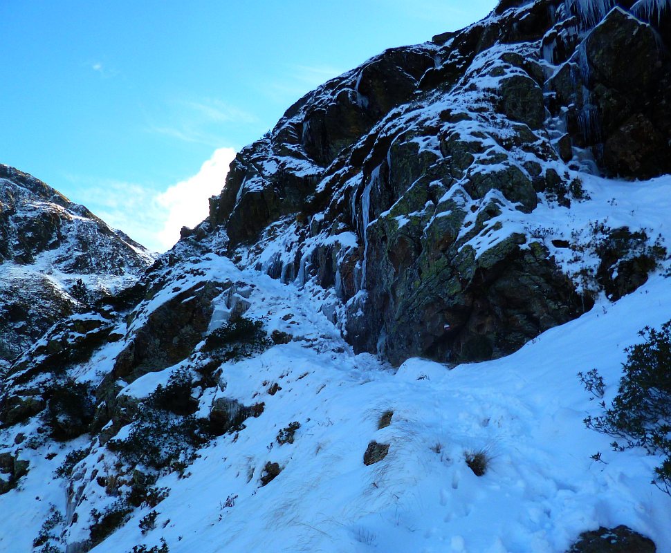 Très belle vue du sommet, montée longue, raide, pas mal de neige, et de la glace +1700m. Il aurait fallu des crampons que je n'avais pas: j'ai trouvé une astuce pour contourner sans danger le passage du GR dans une barre rocheuse avec des cascades de glaces