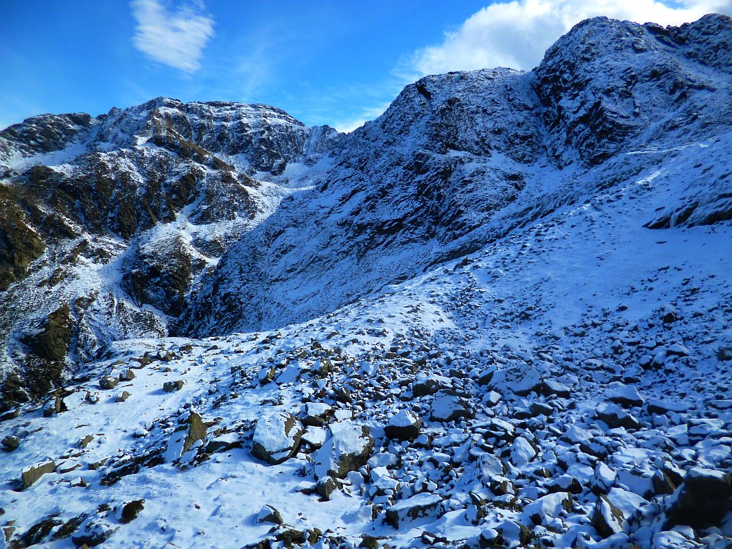 Très belle vue du sommet, montée longue, raide, pas mal de neige, et de la glace +1700m. Il aurait fallu des crampons que je n'avais pas: j'ai trouvé une astuce pour contourner sans danger le passage du GR dans une barre rocheuse avec des cascades de glaces