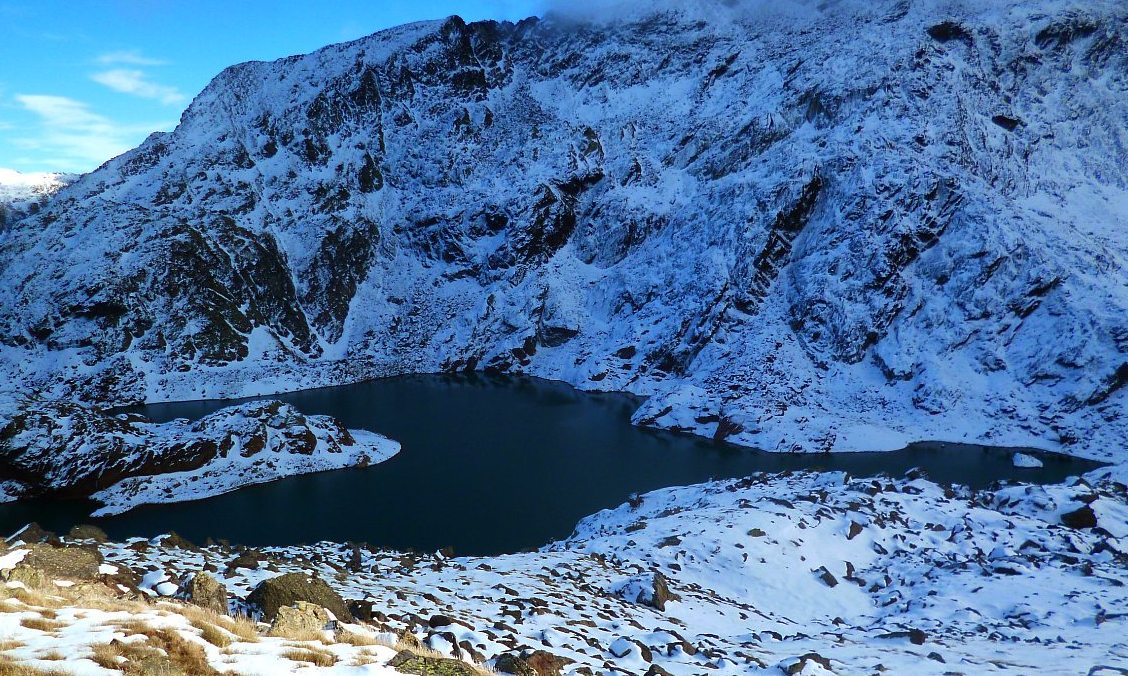 Très belle vue du sommet, montée longue, raide, pas mal de neige, et de la glace +1700m. Il aurait fallu des crampons que je n'avais pas: j'ai trouvé une astuce pour contourner sans danger le passage du GR dans une barre rocheuse avec des cascades de glaces