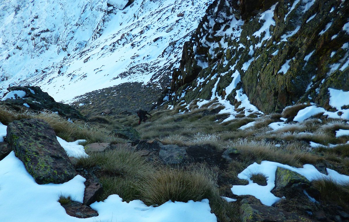 Très belle vue du sommet, montée longue, raide, pas mal de neige, et de la glace +1700m. Il aurait fallu des crampons que je n'avais pas: j'ai trouvé une astuce pour contourner sans danger le passage du GR dans une barre rocheuse avec des cascades de glaces