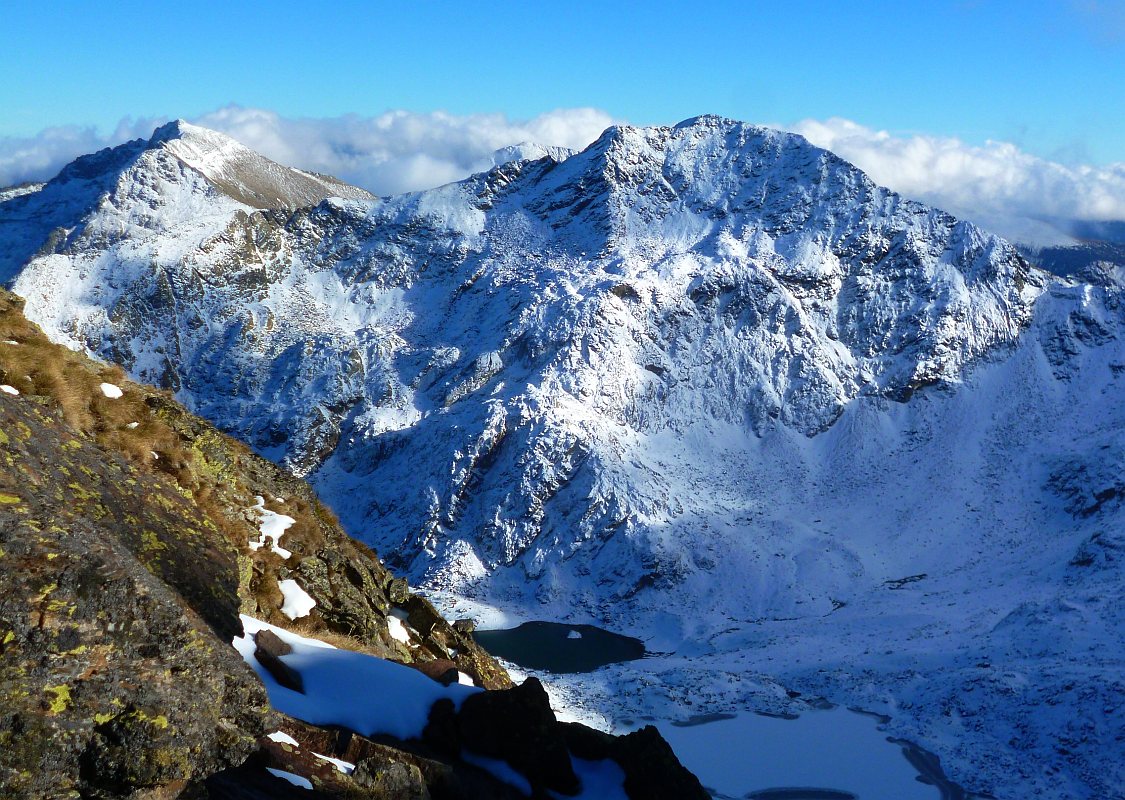 Très belle vue du sommet, montée longue, raide, pas mal de neige, et de la glace +1700m. Il aurait fallu des crampons que je n'avais pas: j'ai trouvé une astuce pour contourner sans danger le passage du GR dans une barre rocheuse avec des cascades de glaces