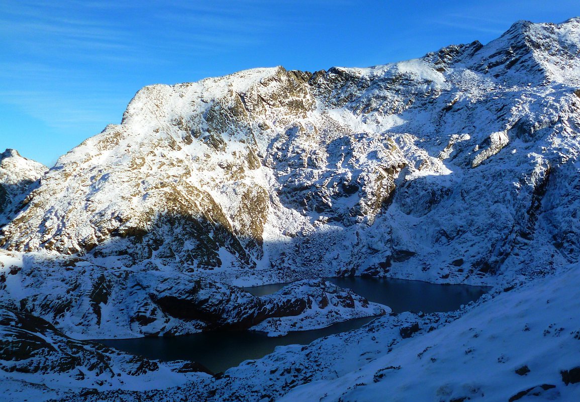 Très belle vue du sommet, montée longue, raide, pas mal de neige, et de la glace +1700m. Il aurait fallu des crampons que je n'avais pas: j'ai trouvé une astuce pour contourner sans danger le passage du GR dans une barre rocheuse avec des cascades de glaces