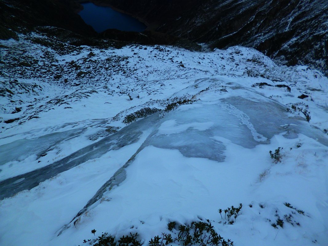 Très belle vue du sommet, montée longue, raide, pas mal de neige, et de la glace +1700m. Il aurait fallu des crampons que je n'avais pas: j'ai trouvé une astuce pour contourner sans danger le passage du GR dans une barre rocheuse avec des cascades de glaces