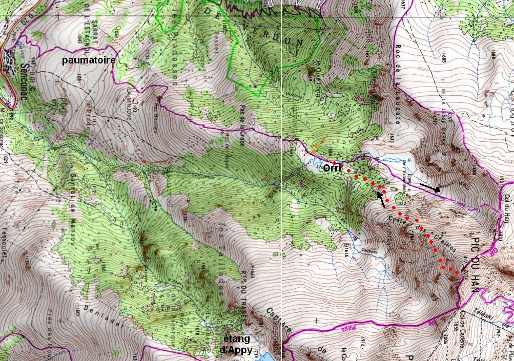 Le sentier est bien marqué, et un peu balisé, mais je l'ai perdu* à la monté comme à la descente au niveau du Sarrat de l'estagnol (entre 1000 et 1200m). Heureusement le roc Boucare est très caractéristique et l'on y retrouve facilement les marques. Plus haut, après un petit étang, le sentier bien balisé de ronds métalliques oranges encastrés dans les hètres part sur la gauche, quittant le tracé de la carte au 1/25000. J'ai choisi de suivre la carte jusqu'au col (de droite: Est) et au sommet, passant par de superbe rochers englacés (du mixte chamoniard !). Au retour j'ai préféré suivre la crête des Grailles Sud-Sud-Est, raide mais herbue, peu enneigée et pas glacée du tout. J'ai ainsi évité au retour le grand replat de l'étang de l'Estagnolette, et j'ai rejoint l'orri vers 1560m en suivant le ruisseau "ouest", dont le fond est plus plat et plus commode que le ruisseau "est" indiqué par la carte (voir mes pointillés rouges sur la Carte pic du Han)Cliquer pour agrandir la photo Stephan Peccini et la Carte IGN annotée ci-dessous Voiture: Toulouse, autoroute de Narbonne, bifurcation vers Foix, passer dans Tarascon sur Ariège, quitter la N20 à Sinsat vers la G (traverser puis longer l'Ariège vers la droite), Verdun/Barry d'en haut, Senconac: ne pas entrer dans le village pour l'encombrer, mais se garer sur la route un peu après le village voir Carte.(1h42 de route).