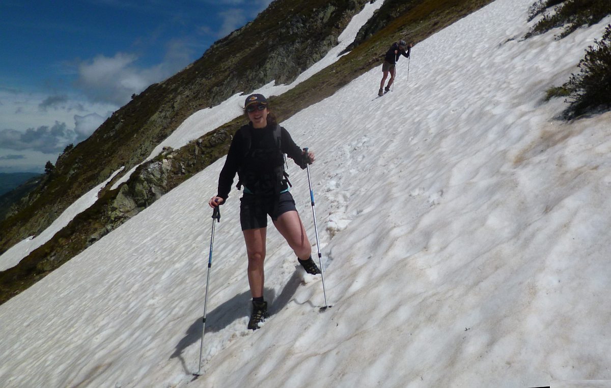 Randonnée fin juin, avec plein de neige au pic de l'Homme (+1100 m montée dont 200m de neige dure à 35-45%, 7h de marche A-R), Denis Corpet et Florence à pied le 29 juin 2013.