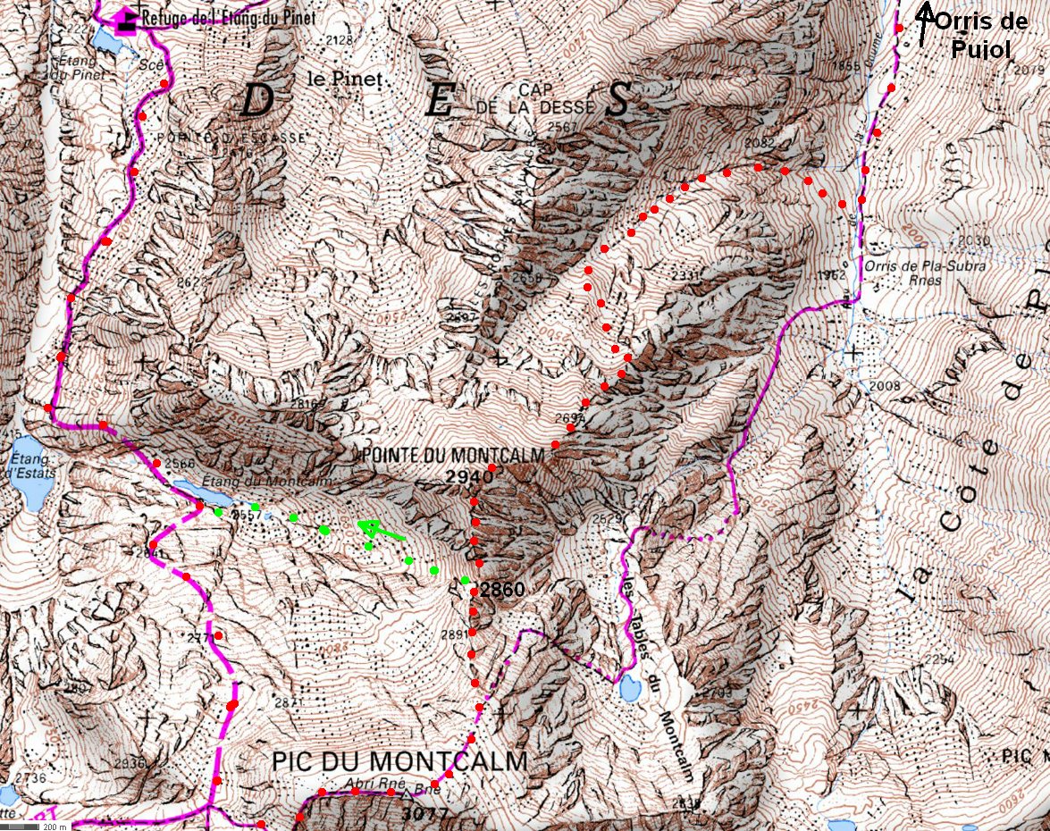 Monter le sentier tracé qui coupe les lacets de la route forestière dans le bois de Fontanal jusqu'aux Orris de Pujol. Un peu après les Orris de Pujol, vers 1950 m traverser le torrent vers la droite et monter un couloir évident (herbe) jusqu'aux névés (2400-2500m) Obliquer vers la gauche par un névé puis du rocher très facile pour rejoindre au mieux l'arête Nord-Est. On suit celle-ci jusqu'à la Pointe du Montcalm (2940m). J'ai cairné tout du long.