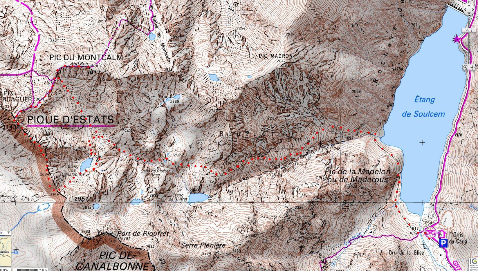 Très belle rando sauvage et raide, faite seul le 9 sept 2012 et refaite le 25 sept 2015, en partant des Orris de Carla, après l'étang de Soulcem, puis en montant le raide vallon de Riufret (mais pas plus raide que la Raspe de Bassiès ou le sentiers des étangs du Picot). En 2012 je suis monté par le col de Riufret et descendu par le pic de Gabarro et l'étang de Canalbonne. En 2015 j'ai fait l'inverse, en montant par Canalbone (tout droit dans le 4 pour accéder au lac) et le Gabarro. Voire la carte de la rando (tirée du geoportail.gouv.fr)