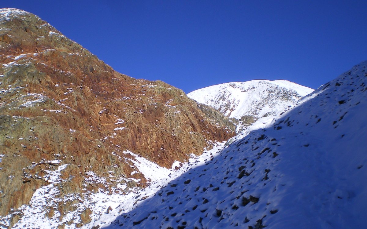 * Erreur ! J'étais évidemment tout seul dans le beau vallon Pujol-Subra, et dans la montée difficile des Tables du Montaclm, et très heureux d'être seul en montagne et de monter à mon rythme. Mais arrivé au sommet du pic du Montacalm, je fus très heureux aussi de voir de belles traces qui montaient du col Riufred 2978m à la pique d'Estat. Heureux de voir des gens, mais aussi heureux d'avoir une trace pour la descente, un peu paumatoire dans mon souvenir. Je me dis: "J'ai des copains dans le coin", et j'ai crié "Hohé ! hohé!", mais rien ne répondit, pas même de la petite coix 3143m toulao. Et en descendant au col, j'ai vu que ces traces, assez profondes (20 cm) étaient bien gelées et dataient de plusieurs jours. visiblement leurs auteurs étaient redescendus de puis longtemps. Et après avoir fait l'AR du col à la Pique d'Estats, je suis descendu avec volupté en courant dans ces belles traces. Mal m'en a pris, car c'étaient, je m'en suis rendu compte un peu tard, des Espagnols qui éteient passés par le GRT entre le Pic du port de Sullo et le Verdager. Ce n'est qu'aux étangs de la Caumette d'Estats que j'ai trouvé bizarre ces TROIS lacs, et que je suis remonté chercher le passage vers le Nord. J'ai appris depuis qu'on pouvait franchir la barre entre ces 3 étangs et l'étang d'Estats 300m plus bas, mais ce n'est pas évident vu d'en bas !