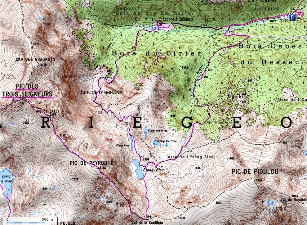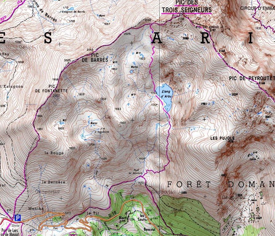 Le chemin se voit très bien: signalé par un panneau, il part en légère descente, puis horizontalement à droite de la route. Il est bien marqué de ronds et de rectangles jaunes. Marcher en gros "à plat" jusqu'au pont de Canioule (20 min), puis tourner à G, pour monter raide vers l'étang d'Arbu, en croisant 2 beaux Orris (il reste du chemin après eux): on est à l'étang d'Arbu en une heure (1h30 maxi). Contourner ce très bel étang et ses 2 jolis îles par la G. Quitter la rive en suivant bien les marques jaunes qui montent à G le long d'un ruisseau (étoiles rouges sur carte ci-contre =>). On quittent le ruisseau en tournant vers la Dr pour revenir au dessus des barres rocheuses qui dominent l'étang au N. Ensuite on repart vers le N, toujours flèché de jaune, en se glissant de replats herbus en côtes, pour rejoindre l'arête W des 3 Seigneurs vers 2140m (belles dalles de granite). Suivre alors l'arête au mieux jusqu'au sommet, toujours sur un sentier (3h de marche depuis l'auto).