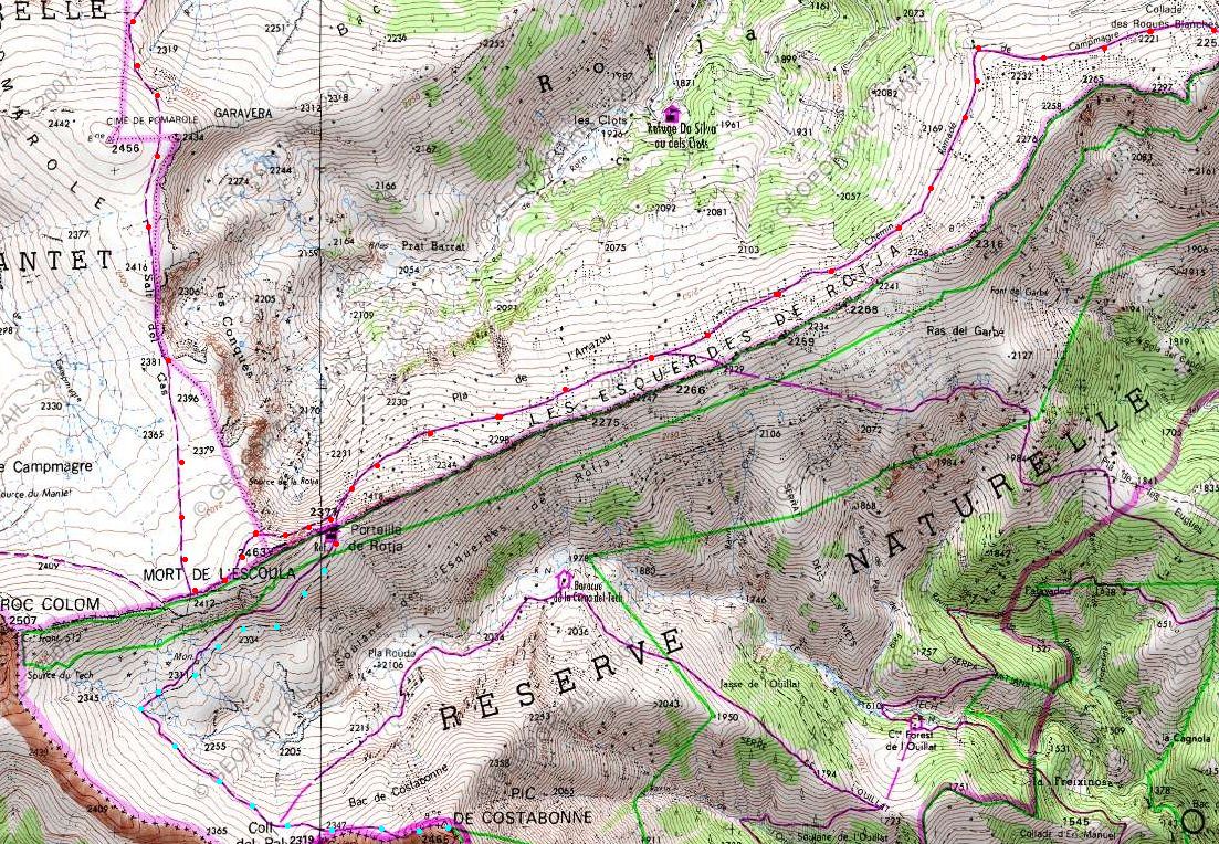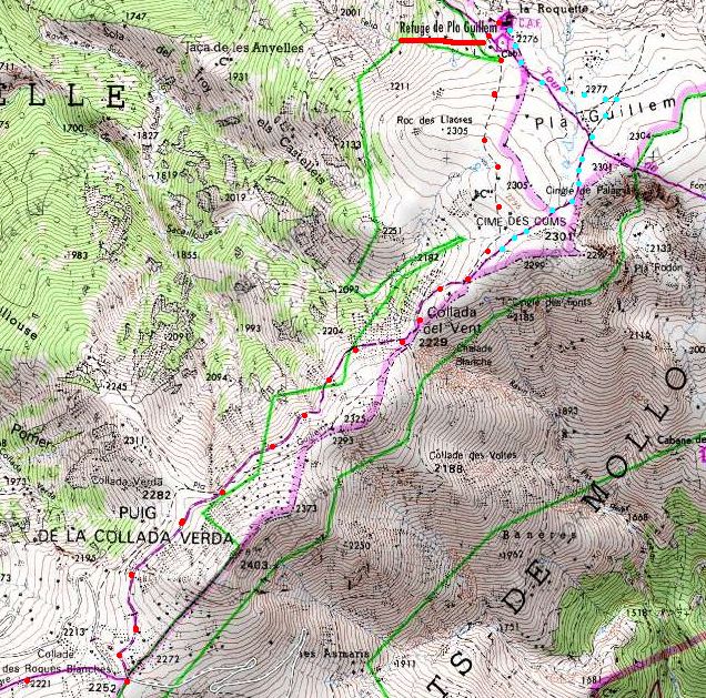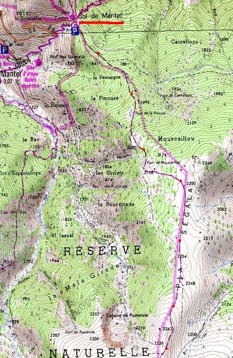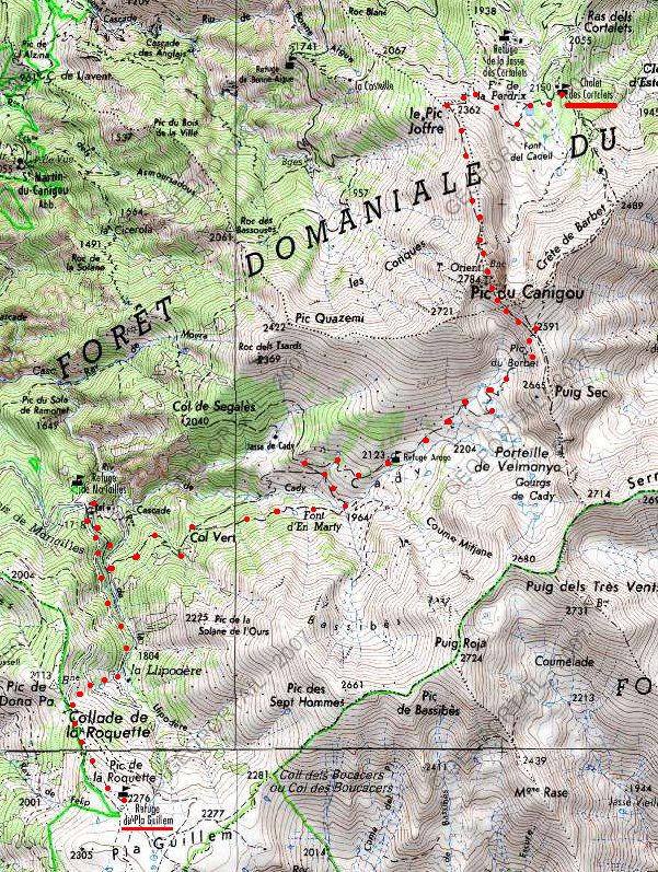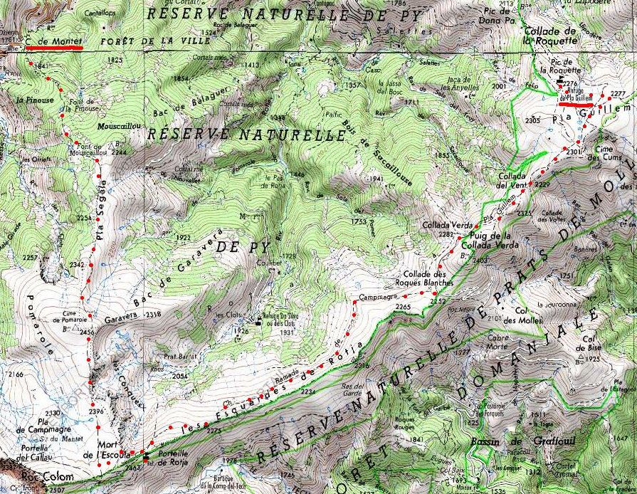 Jour 1 = Col de Mantet, 1760m départ 0h // Pla Segala, 2250m 1h // Mort de l'Escoula, 2412m 2h30 // Porteille de Roja 2377m, 3h // Collade des Roques-Blanches 2252m, 5h // Refuge de Pla Guillem, 2276m, 6h30