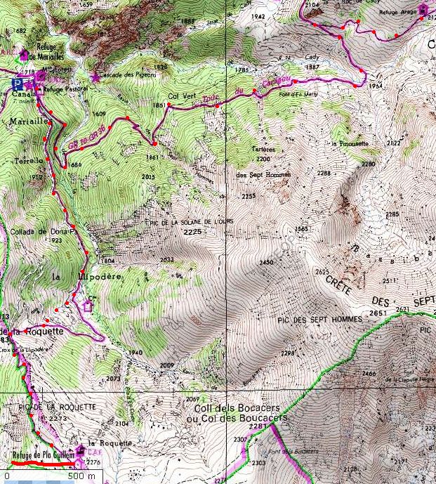 => Descendre vers le Nord-Ouest pour rejoindre le refuge de Marialles. En détail, on quitte le refuge en descendant plein Ouest et l'on croise vite un bon sentier qui descend vers le NW à gauche de l'éperon et du pic de la Roquette, puis rejoint la